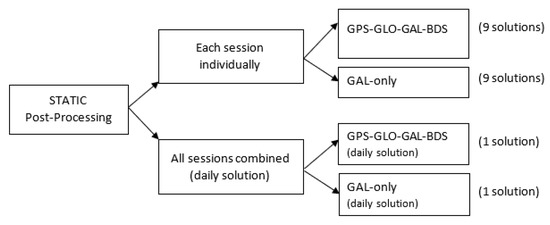 Static post-processing schema in TBC: each session was processed providing solutions based on GGGB and GAL-only observation data.