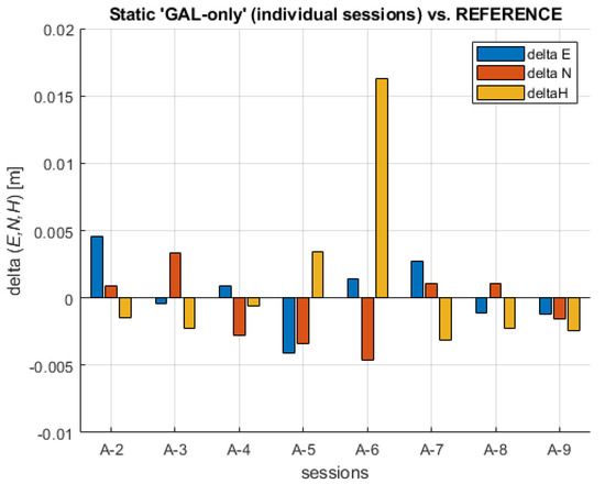 If each individual session result based on GAL-only data is compared to the REFERENCE, the following maximum absolute difference values are obtained: MAX (ABS (ΔE)) = 0.0046 m, MAX (ABS (ΔN)) = 0.0046 m, and MAX (ABS (ΔH)) = 0.0163 m. The differences between each individual ‘GAL-only’ static session and the REFERENCE are shown in Figure 6.