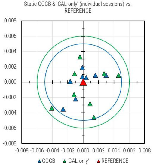 All individual static GGGB and ‘GAL-only’ sessions results plotted together: green circle (6 mm) and cyan circle (5 cm) show the maximum departure of ‘GAL-only’ and GGGB from the REFERENCE solution, respectively.