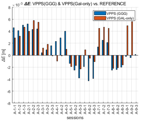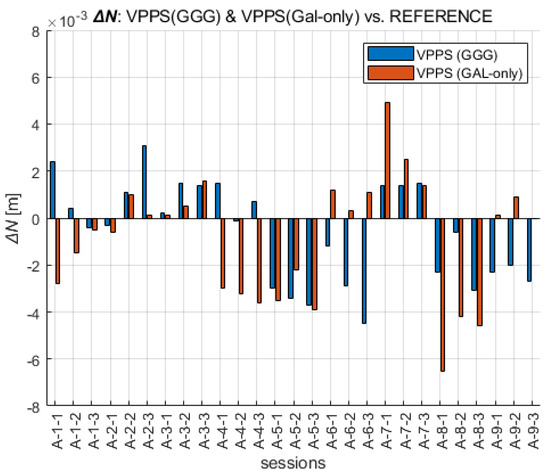When the ΔN differences are analyzed across all VPPS solutions, the results are given as follows. The values of the differences displayed in Figure 10 are in the range of ΔN GGG (−4.5 mm to +3.1 mm) and ΔN GAL-only (−6.5 mm to 4.9 mm). The range values (7.6 mm vs. 11.4 mm) along with the extreme value are higher for GAL-only solutions; the RMS (2.2 mm vs. 2.7 mm) and STDEV (2.1 mm vs. 2.6 mm) follow the same pattern, giving slightly higher values for GAL-only results.