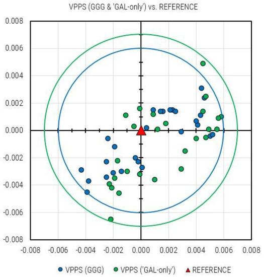 If the planar (2D) departure of VPPS (GGG) and VPPS (GAL-only) solutions from the REFERENCE position are considered, the following values are obtained: GGG (0.4 mm to 6.0 mm), GAL-only (+0.6 to +6.9 mm). This is an additional confirmation that MEDIAN (3.3 mm) and AVERAGE (3.5 mm) planar deviations of the VPPS (GGG) solutions are slightly smaller compared to GAL-only solutions: MEDIAN (4.0 mm) and AVERAGE (3.9 mm). If all solutions (27 GGG and 26 GAL-only) are plotted together, Figure 12 is displayed.