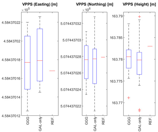 Considering the range values, it can be clearly seen that the GPPS results are generally better than the VPPS results. Considering the VPPS results, a smaller range has been reached for solutions based on GGG than those based on GAL-only observations. A similar conclusion can be drawn for GPPS solutions: GGGB solutions show smaller range values than solutions based on GAL-only.