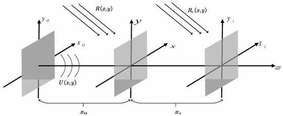 Digital holography uses CCD to record the interference between an object light wave and reference light wave ; the recording distance is , as shown in Figure 1. The intensity of the interference field can be expressed as: