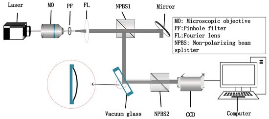 Based on the basic theory of digital holography, we designed an interferometric optical path Mach–Zehnder interferometer to measure the vacuum degree of vacuum glass. The digital holographic optical path is shown in Figure 2, and operates as follows. The light emitted by the laser becomes a parallel light after being collimated using a microscopic objective (MO), a pinhole filter (PF) and a Fourier lens (FL). Next, the parallel beam is divided into reference light and measurement light using a nonpolarizing beam splitter (NBPS1). The measurement light propagates down to the optical pressure sensor inside the vacuum glass to form scattered light, while the reference light, reflected by a plane mirror, propagates to the right and downward, followed by the beam combination with scattered light in the NPBS2. Finally, the interference hologram is recorded using a charge coupled device (CCD) and reconstructed by the computer.