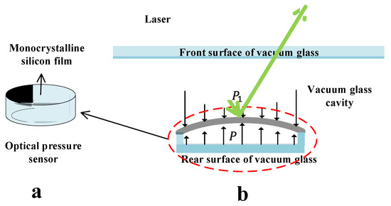 The optical pressure sensor was fixed inside the vacuum glass, as shown in Figure 3b, and was composed of a base and a film, as shown in Figure 3a. The base was a cylindrical cavity with an opening at one end, made of glass. The film was tightly adhered to the base’s opening to form a tiny cavity with excellent air tightness. The pressure P of this tiny cavity was always constant during the detection process, and its value could be given according to the detection range. In this experiment, the pressure of the tiny cavity was standard atmospheric pressure. When the pressure P1 in the glass cavity changed, the film deformed due to the pressure difference.