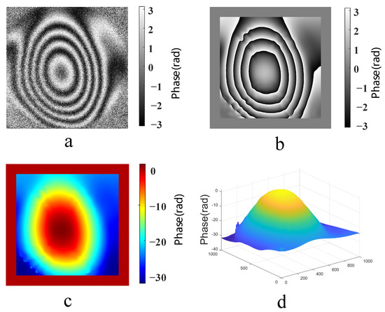 (a) Wrapped phase difference map without noise reduction, (b) wrapped phase difference map after noise reduction, (c) unwrapped phase difference map and (d) three-dimensional map of the unwrapped phase difference.