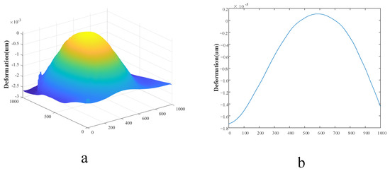 Film deformation could be calculated by substituting the real phase difference into Equation (4), as shown in Figure 6. The three-dimensional film deformation map is shown in Figure 6a; the maximum film deformation was located at the center of the film, which was consistent with results derived from the previous theory. Figure 5b is the middle profile of Figure 6a; when the air leakage was 1070 pa, the deformation at the center of the film was 1.83 μm. This result indicates that digital holography can be used to detect deformation at the micron level, and also proves that it is feasible to detect the vacuum degree of vacuum glass using digital holography.