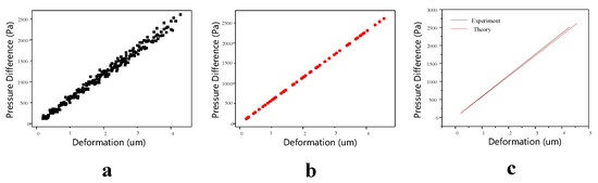 Within the monocrystalline silicon film’s small deflection deformation range [32], we pumped the vacuum glass into different initial vacuums , measured the film’s deformation under different vacuum attenuations and recorded the corresponding pressure differences. We adopted the cross-subtraction method of pressure difference to eliminate the deviation caused by different initial morphology of the film and took the mean value of multiple deformations at around the maximum deformation as the final measured value. In total, 239 data points of pressure differences and deformations were obtained. Figure 6a illustrates that the monocrystalline silicon film’s deformation changed within (0, 4.5) μm, and the corresponding pressure difference changed within [0, 2600] pa. The smaller the deformation, the smaller the pressure difference and the more concentrated the data points; the pressure difference showed a good linear relationship with the deformation. With an increase in deformation, data point concentration decreased, but there was still a good linear relationship between deformation and pressure difference. These results indicate that the optical pressure sensor could convert the deformation into pressure difference accurately and linearly. In addition, the initial vacuum degree’s influence on the change in the film’s pressure difference with deformation was negligible. When vacuum attenuation exceeded 2600 pa, the fringes in the phase difference were too dense, resulting in the phase information being masked by speckle noise and difficult to reconstruct. Therefore, it was beyond the sensor’s pressure difference measurement range. Of course, if the film’s geometric or material parameters in the sensor were changed, the sensor’s pressure difference measurement range would also change accordingly.
