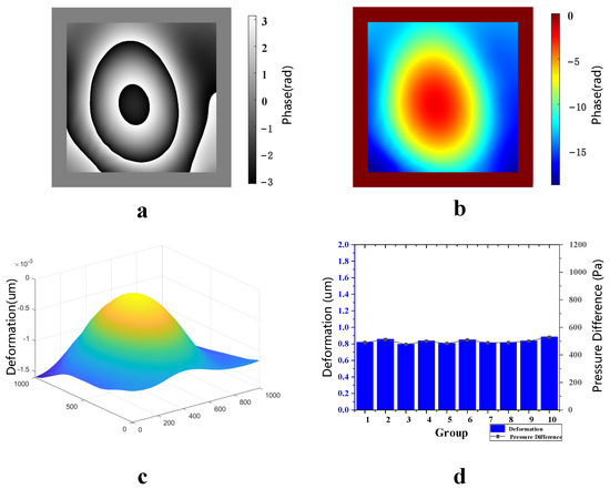 When the vacuum glass’ initial vacuum degree was −5 Kpa, the air valve was controlled to let it leak slowly for 2 min; then, the film’s deformations in the optical pressure sensor before and after air leakage were measured. These measurements were repeated for 10 groups. Figure 8a shows the wrapped phase difference map after noise reduction, Figure 8b shows the unwrapped phase difference map, Figure 8c shows the three-dimensional deformation map of film in the optical pressure sensor, and Figure 8d shows the deformation measured for 10 groups. The deformations of these 10 groups were almost equal, and the standard deviation of 0.01672 μm indicated that the fluctuation between these 10 data groups was quite small, which further proves that the detection system’s stability was very high. According to the fitting results, the average value was 160 pa of pressure difference corresponding to 10 deformation groups for the optical pressure sensor; therefore, the vacuum degree of the vacuum glass after leakage was −4.84 Kpa. In comparison, the vacuum degree of the vacuum glass after leakage, measured using an electronic differential pressure meter, was also −4.84 Kpa.