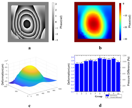 Measurement results with an initial vacuum of −5 kpa. (a) Wrapped phase difference map after noise reduction, (b) unwrapped phase difference map, (c) three-dimensional deformation map and (d) 10 deformation measurements and corresponding air leakages.