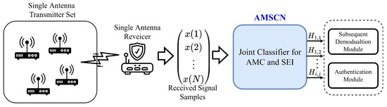 This paper is organized as follows. In Section 2, we discuss the common feature design and model design approaches in the AMC and SEI domains, as well as the design of multitask models in deep learning. In Section 3, we introduce the entire classification framework, including the system model and the signal model. Section 4 details the design of the core module and the training method of the AMSCN. The results in terms of the accuracy and the additional ablation experiments are shown in Section 5. Finally, the conclusion and the prospective research activities are presented in Section 6.