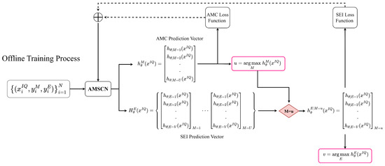 The goal of the AMSCN model is to optimize the two tasks simultaneously. In this process, the classification process of the AMC was relatively independent, while the classification process of the SEI needed the prediction results of the AMC to improve this task. The overall loss of the AMSCN was derived by summing the cross-entropy losses of the two tasks, namely
