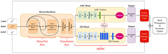 - The MDHC consists of an AMC head and an SEI head. It can enhance the correlation between the two tasks through a mask mechanism and finally output the classification results of the two tasks. With the help of the MDHC, we are able to balance the learning process using only the sum of the cross-entropy losses of the two tasks;