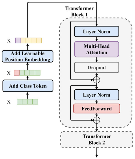 The second transformer block, shown in Figure 5, had exactly the same parameters as the first transformer block; the stacked transformer blocks can achieve a more complex synthesis of temporal information. We took out the first node of the sequence output by the second transformer block, which was the classification token, as the semantic feature of the shared-backbone network output. A more specific hyperparameter setting is shown in Table 2.