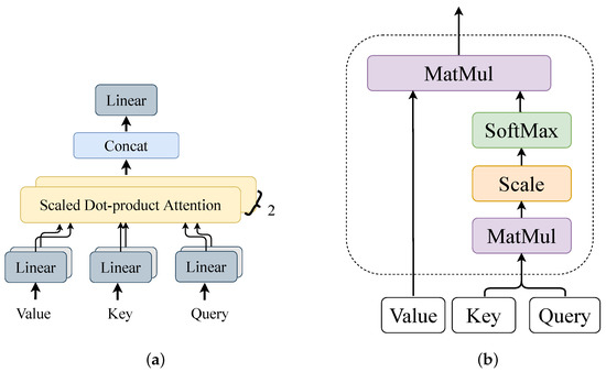 The structure of the self-attention part a transformer block. (a) Details of the multi-head attention structure. (b) Scaled dot-product attention structure.