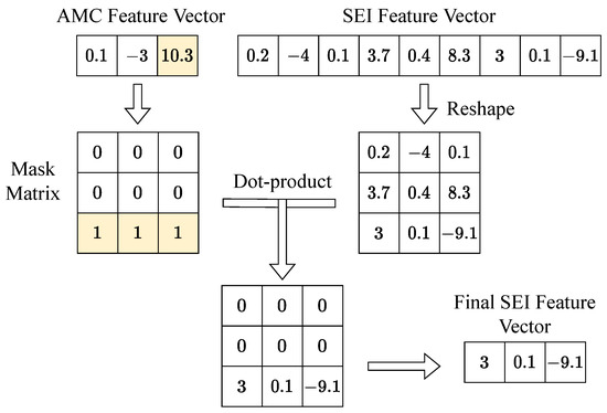 The calculation process of the SEI feature vectors. The mask matrix is generated from the AMC feature vector. The subscript of the largest element of the AMC feature vector determines which row of the mask matrix is 1. The colored part of this figure indicates the maximum value in the vector and the row of the matrix that takes 1.