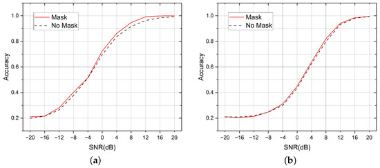 We used the average accuracy to measure the difference in performance between the different methods. For a given task, the average accuracy is the average probability of being able to classify all the samples of the test set correctly, and the average accuracy can be seen as the average of the accuracies under each SNR in the graph. In the AMC task, the average accuracy of using the mask method was 0.65, and it was 0.6327 without the mask; in the SEI task, the average accuracy of using the mask was 0.5472, and it was 0.5413 without the mask.