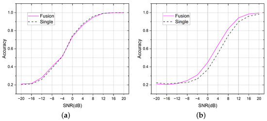 In Figure 9a, the accuracy curve of the single-task model was slightly higher at high SNRs than that of the dual-task model, which we believe is mainly caused by setting the average accuracy as the optimization target. During model training, the optimization weights were the same for each SNR, but the accuracy curve may fluctuate in the range of high and low SNRs when the average accuracy is similar. Specifically, in the early stage of model optimization, the accuracy under low SNR and high SNR would increase simultaneously, while at the end of model convergence, the accuracy under high SNR would decrease if the model gradually advances toward improving the accuracy under low SNR. This observation may be caused by the conflicting judgment methods between the signal feature vectors of various modulation types at low SNRs and those at high SNRs, which makes it difficult for the model to improve the accuracy at each SNR simultaneously. In addition, the structure of the AMSCN showed that the model was not affected by the predicted results of SEI under the AMC task, and thus the dual task maintained an essentially similar performance to the single task. The reason for our design is that we argue the judgment difficulty of the AMC task is lower than that of the SEI, i.e., the hardware impairments of the transmitter have less impact on the signal characteristics than the modulation type, and thus the detection results of the AMC task do not suffer from the SEI task. Therefore, the advantage of our model is not to improve the performance of AMC task, instead, we exploit the strength of multi-task learning to improve the performance of SEI tasks while maintaining the performance of AMC.