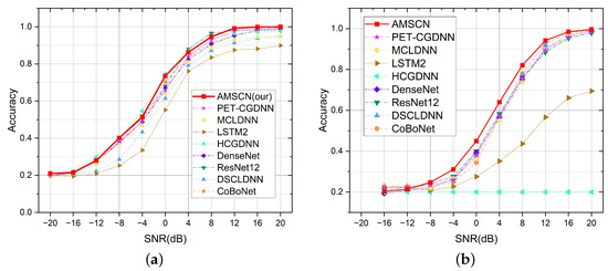 We selected eight popular signal classification models to compare with our AMSCN model. Some of these models have achieved state-of-the-art results with publicly available AMC or SEI datasets [57,58]. The ResNet12 is a simplified version of ResNet18 [59], and the DenseNet-backbone is the same as the DenseNet part of the AMSCN. All models were trained and tested in a single-task classification manner only. However, since the length of our sample data is 256, which is different from the length of the data on which these models were designed, the training results tend to be poor when the hyperparameters are set according to the original version; therefore, we fine-tuned the hyperparameters of these models. These adjustments included changing the original classifier hidden layer unit of 128 to 512, and the original LSTM structure’s hidden unit of 128 to 256 or 512. After the adjustments, the prediction accuracy results are generally better than the original parameters.