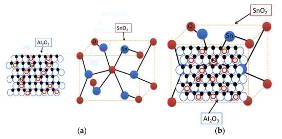 Schematic diagram of the material structure: (a) SnO2 and Al2O3 structure; and (b) SnO2/Al2O3 composite structure.