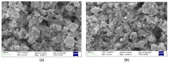 Figure 2 shows the morphological results of the Pd–Pt/SnO2 thin films and Pd–Pt/SnO2/Al2O3 thin films. As the figure shows, the microscopic dimensions of the Pd–Pt/SnO2 material were 60–80 nm and the perimetric dimensions of the Pd–Pt/SnO2/Al2O3 material were 20–60 nm. The sensitive film had an increased specific surface area and more active sites after adding Al2O3, and its adsorption effect on gases was enhanced.