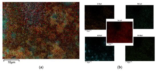 Elemental distribution of Pd–Pt/SnO2/Al2O3 films: (a) elegional elemental distribution maps; and (b) single elemental distribution maps.