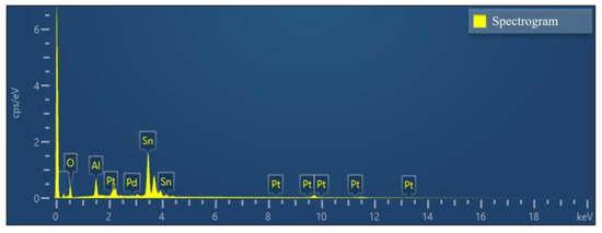 Figure 3 and Figure 4 and Table 1 shows the results of the energy spectrum characterization analysis of the Pd–Pt/SnO2/Al2O3 thin film. Figure 3 shows that each element (Al, Sn, O, Pd, and Pt) was present in the composite film and can be uniformly distributed, proving that the composite film prepared was consistent with the above theoretical analysis.
