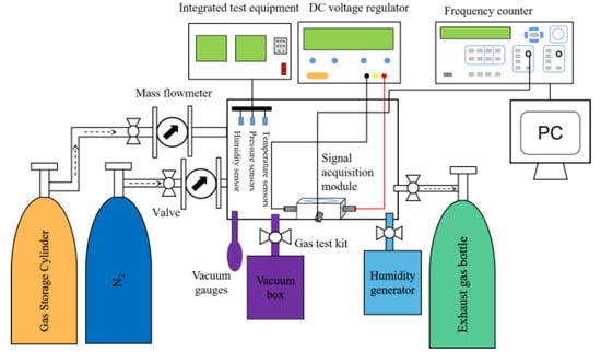 The main purpose of building the test system of the SAW CO gas sensor was to separate the interference factors such as the temperature, humidity, and pressure from the test system, and discuss and analyze them separately, thereby reducing the test error. Information on the CO gas performance test system and the test apparatus is shown in Figure 5 and Table 2, respectively.