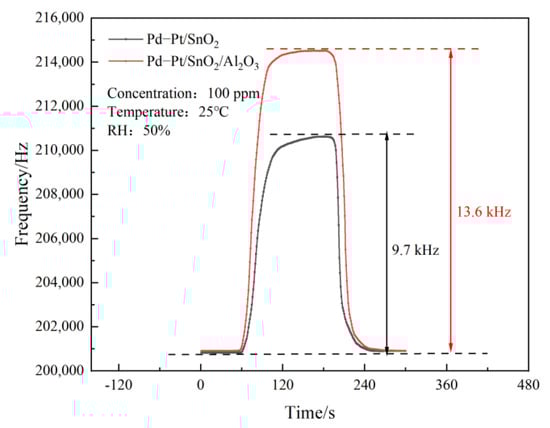The figure shows that the frequency response of the Pd–Pt/SnO2/Al2O3 film SAW sensor to the 100 ppm CO gas concentration (13.6 kHz) was significantly higher than that of the Pd–Pt/SnO2 film SAW sensor in the 100 ppm CO gas concentration (9.7 kHz). This shows that the Pd–Pt/SnO2/Al2O3 composite film can inherit the mesoporous structure of Al2O3, increases the specific surface area, and improve the sensitivity of the sensor.