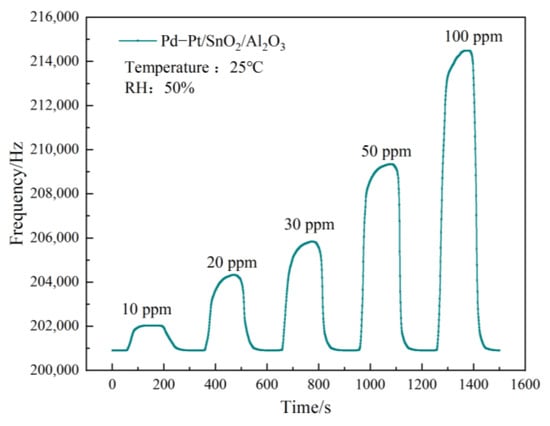 Under the same test conditions, Figure 7 shows the SAW sensor based on the Pd–Pt/SnO2/Al2O3 sensitive film for the 10–100 ppm CO dynamic response of the gas concentration. The figure shows that the response frequency of the 10 ppm CO gas concentration was 1.1 kHz, and that the response frequency of the 100 ppm CO gas concentration reached 13.6 kHz, indicating that the SAW sensor under the membrane has high-frequency response characteristics to CO gas.