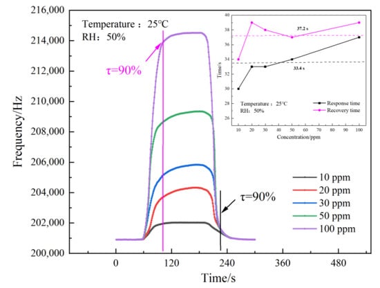 Under the same test conditions (25 °C, RH 50%), through the different CO gas concentrations configured, the SAW sensor of the Pd–Pt/SnO2/Al2O3 film was used to measure the 10 ppm to 100 ppm response recovery curve. The test results are shown in Figure 8. The figure shows that the SAW sensor based on the Pd–Pt/SnO2/Al2O3 composite film has a good response and recovery performance to different CO gas concentrations. Among them, 90% of the average response time equated to about 33.4 s, and 90% of the average recovery time equated to about 37.2 s. The response speed of the sensor was slightly faster than the recovery speed.