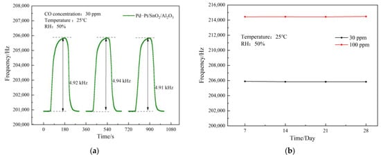Under the same test conditions, use the SAW sensor was used with the Pd–Pt/SnO2/Al2O3 composite film to test the CO gas within 30 days, and the data were recorded every 7 days to investigate the long-term stability of the SAW sensor. For this long-term stability test, CO gas with concentrations of 30 ppm and 100 ppm were selected as the two groups of experimental objects, and the test results are shown in Figure 9b. The figure shows that the sensor had a stable response to 30 ppm and 100 ppm CO gas within 30 days of testing, demonstrating that the SAW sensor based on the Pd–Pt/SnO2/Al2O3 composite sensitive film has good long-term stability for CO gas.
