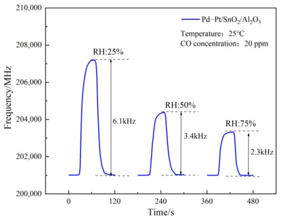 The figure demonstrates that, with the increase in test humidity, the response frequency of the SAW gas sensor to CO decreased, the RH increased from 25% to 50% (and then to 75%), and the frequency decreased from 6.1 kHz to 3.4 kHz (and then to 2.3 kHz). The Pd–Pt/SnO2/Al2O3 sensitive film’s response frequency to CO gas decreased, possibly because the higher humidity meant more H2O molecules could be deposited on the film. On the one hand, H2O molecules occupied the active sites on the film by adsorbing CO gas. On the other hand, after more H2O molecules were adsorbed on the film, not only did the conductivity and elastic modulus change to some extent, but the quality of the film also improved. Under the mechanism of the mass loading effect, the response frequency of the film for detecting gas decreased. However, the SAW gas sensor based on the Pd–Pt/SnO2/Al2O3 sensitive film was still found to have a good humidity sensitive detection performance for CO gas in a certain humidity environment