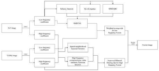 - The low-frequency components of ToF and color image after multiple lighting segmentation using a PCNN are fused using the weighted average rule, and the high-frequency components are fused using improved bilateral filters.