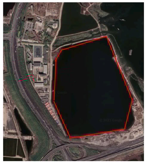Figure 3). The operational depth of the test water area was 9 m, and the size was 800 m (length) × 640 m (width). The area was selected because the surroundings are relatively empty, which is convenient to lay out the calibrators. The longitude and latitude coordinates of the test area are given in