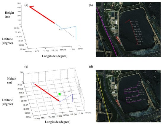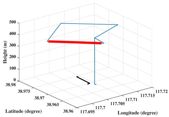Figure 5, the blue curve represents the whole process of taking off, climbing, executing the task, and landing of the UAV. The bold red curve represents the trace when the MiniSAR was working, and the black curve represents the movement trail of the UUV.