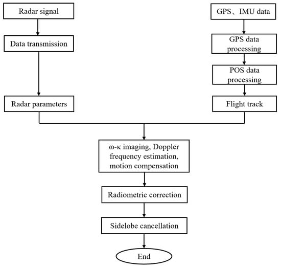 Figure 6. The required data include original radar echo data, radar parameters, GPS data, IMU data, route of flight, and data from the position and orientation system (POS). The key steps include
