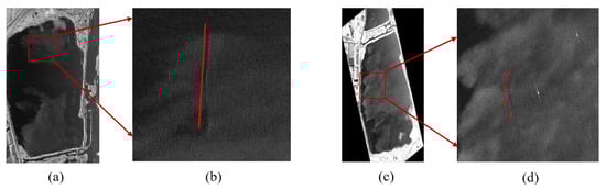 Imaging results of (a,c) Ku-band MiniSAR system detection with UUV having depth of 1 m and speed of 3 knots and (b,d) enlarged partial figure of (a,c).