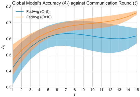 Generally, only a fraction of the total clients is selected for training per communication round, , to reduce the total communication cost in FL. Let denote the total number of participating clients per round. When is low, it is difficult to ensure the sampled data resemble the global data distribution. This also leads to high between and , which again contributes to the divergence of from . Let be the accuracy of the global model at communication round . Figure 2 shows the accuracy curve of FedAvg models trained on a non-IID CIFAR-10 dataset using and . First, the average accuracy of the global model after communication round was 62.73% and 72.79% for and , respectively. Additionally, the fluctuation and standard deviation of the accuracy curve were higher when as compared to . It is shown that FedAvg (or FL in general) had inferior performance when the number of participating clients per round is low.
