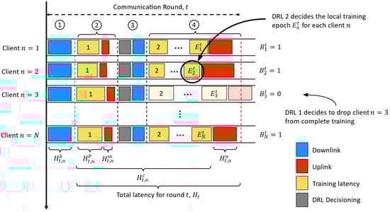 - Early client termination: Based on the collected client states, the DRL agents at the FL server will drop non-essential clients to reduce total latency and total communication cost for round . The decision made by DRL agents will be sent to each client.