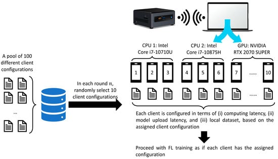 Figure 4 depicts the system model for the proposed FL protocol. Note that the model broadcasting latency was not included into since it is not part of the FL optimization problem. Additionally, the time latency to upload client metadata to the server, , was ignored. This is because the metadata file size was only 278 bytes, while even a lightweight MobileNetV2 file is 24.5 megabytes. Thus, is negligible since .
