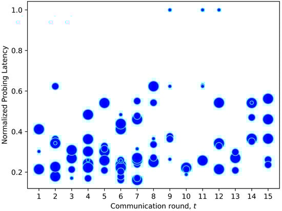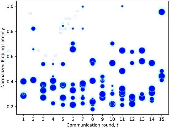 As mentioned earlier, conventional FL training sets the same local epoch for all clients, disregarding their computing resources. Hence, one of the contributions of FedDdrl is to learn the optimal strategy to adjust the local epoch count for each client dynamically. In Figure 12, we plotted the local epoch count corresponding to each selected client from the scenario in Figure 11. Bigger dots indicate that a higher local epoch count was assigned for the corresponding clients. It was found that FedDdrl tended to set a lower epoch count (smaller dots) for clients with higher probing latency. This method could reduce the total training latency since clients with limited computing power did not have to participate in long training epochs. On the other hand, clients with lower probing latency tended to have a higher epoch count. This strategy can fully utilize the computing resource of clients with stronger computing power since they can continue training while waiting for other clients to finish. However, this was not always the case, as shown in Figure 13. On certain occasions, FedDdrl set a high epoch count for clients with long probing latency if the data in these clients were crucial for FL convergence. In any case, FedDdrl was superior to FedMarl, where the FedMarl could either select or terminate a client without the third option of selecting the clients and dynamically tuning the local epoch.