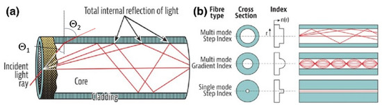 (a) The TIR mechanism and (b) the typical structure of multi-mode (MM) fibers with a larger core able to propagate multiple modes, and single-mode (SM), which are the most common with a small core [23].