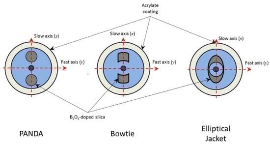 Polarization-maintaining fibers (PMFs) are SM fibers in which the guided light maintains its linear polarization state. This is important for some applications such as interferometric sensors, gyroscopes, and coherent communications [32]. There are different ways to obtain polarization maintenance in PMF, as reported in Figure 4. The most common approaches are noncircular core and asymmetrical lateral stress. The latter is used in PANDA fibers in which the asymmetrical lateral stress is introduced by two stress rods made of silica glass modified with boron and placed inside the clad [33]. The presence of stress along one direction breaks the symmetry of the core, introducing a birefringence where the RI has a slightly higher value (slow axis) along one direction. This allows for decoupling the modes in the orthogonal axes and maintaining the polarization if the light is linearly polarized along the direction of one of these two main axes.