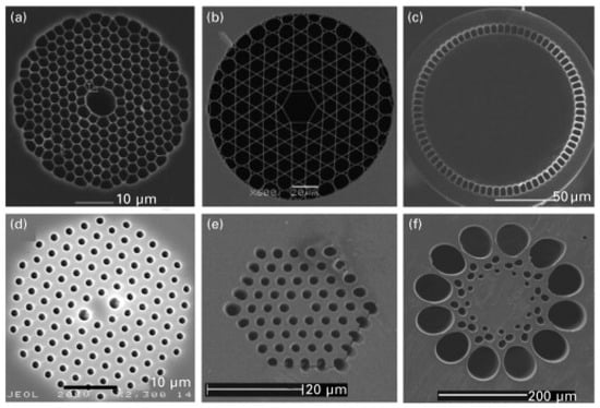 First proposed in the early 1970s by Kaiser et al. [36] to reduce losses, microstructured optical fibers (MOFs), such as the ones in Figure 5, were first only produced in the 2000s due to their complexity of production. There are two main categories of MOFs: structured optical fibers based on TIR effect to guide light and photonic crystal (or bandgap) fibers, which are treated separately as they leverage a different light-guiding mechanism.
