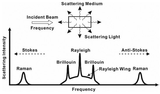 Scattering is a random statistical phenomenon that occurs in all angular directions, and in the case of elastic scattering, the frequency of the scattered light is conserved with respect to the input one (Rayleigh). Additionally, if the frequency of light or its energy changes during the scattering process by absorbing or giving energy to the fiber material, then the scattering is called inelastic (Raman and Brillouin). DOFS can thus be classified by what happens to the frequency of the incident light and the occurring scattering mechanism, as shown in Figure 9.