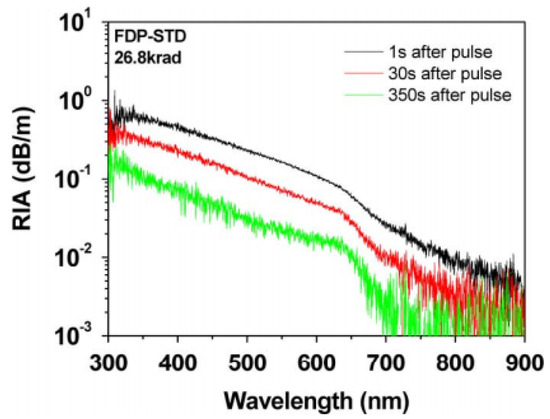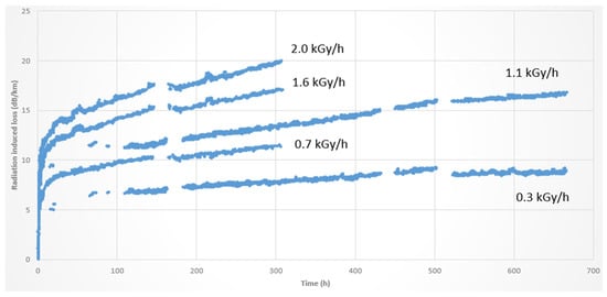 - Friebele, E.J.; Askins, C.G.; Gingerich, M.E. Effect of Low Dose Rate Irradiation on Doped Silica Core Optical Fibers. Appl. Opt. 1984, 23, 4202–4208. [Google Scholar] [CrossRef]