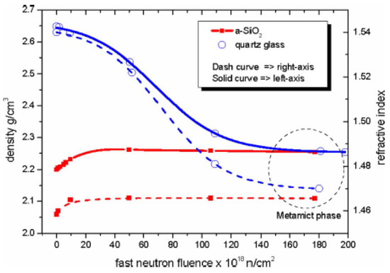 - Primak, W. Fast-Neutron-Induced Changes in Quartz and Vitreous Silica. Phys. Rev. 1958, 110, 1240–1254. [Google Scholar] [CrossRef]