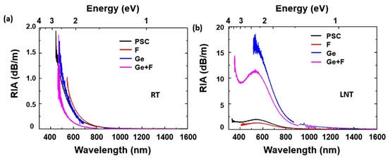 - Kashaykin, P.F.; Tomashuk, A.L.; Salgansky, M.Y.; Guryanov, A.N.; Dianov, E.M. Anomalies and Peculiarities of Radiation-Induced Light Absorption in Pure Silica Optical Fibers at Different Temperatures. J. Appl. Phys. 2017, 121, 213104. [Google Scholar] [CrossRef]