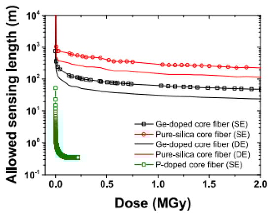 - Faustov, A.V.; Gusarov, A.; Wuilpart, M.; Fotiadi, A.A.; Liokumovich, L.B.; Zolotovskiy, I.O.; Tomashuk, A.L.; de Schoutheete, T.; Mégret, P. Comparison of Gamma-Radiation Induced Attenuation in Al-Doped, P-Doped and Ge-Doped Fibres for Dosimetry. IEEE Trans. Nucl. Sci. 2013, 60, 2511–2517. [Google Scholar] [CrossRef]